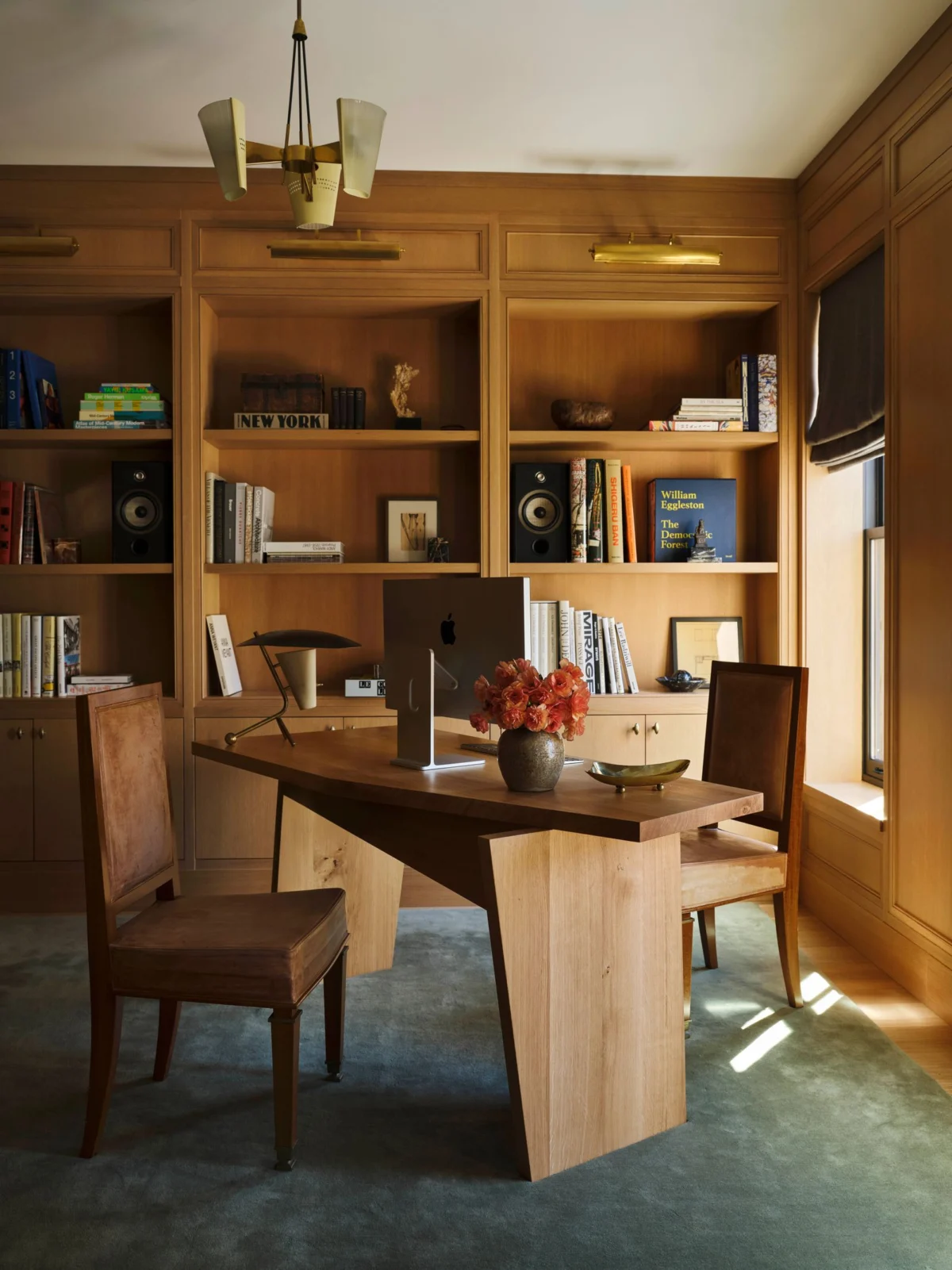 The fourth floor is dedicated to the couple’s professional lives, housing offices designed to offer both connection and separation. The husband’s office features oak paneling and bookshelves finished in a warm honey hue. This space is furnished with André Arbus chairs and a custom Nazara Lazaro Crooked desk, commissioned through Galerie Philia. A 1950s Arredoluce ceiling fixture and a Pierre Guariche table lamp from the same era, both sourced from 1stDibs, illuminate the area, while Visual Comfort picture lights complete the ensemble.