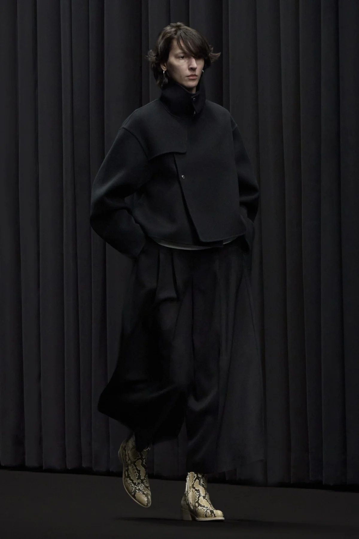 The collection introduced double-breasted jackets cropped high at the waist. These were styled with exceptionally roomy tailored trousers, creating a silhouette that feels both grounded and architectural. This contrast in length and volume is a recurring theme in modern Japanese design, but Hyke executes it with a specific focus on the drape of technical fabrics.